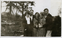 A photograph of Pacific University students, Edith Hansen McGill and Douglas Dreeszen, with a group of fellow students holding the Boxer mascot. The original Boxer mascot was a gift to the school from a missionary named Reverend J. E. Walker. He acquired the Boxer while on a mission trip to China. The Boxer went missing after a Boxer Toss in 1969. This photograph appears in an album that was compiled by Edith Hansen McGill, a 1930 Pacific University graduate.