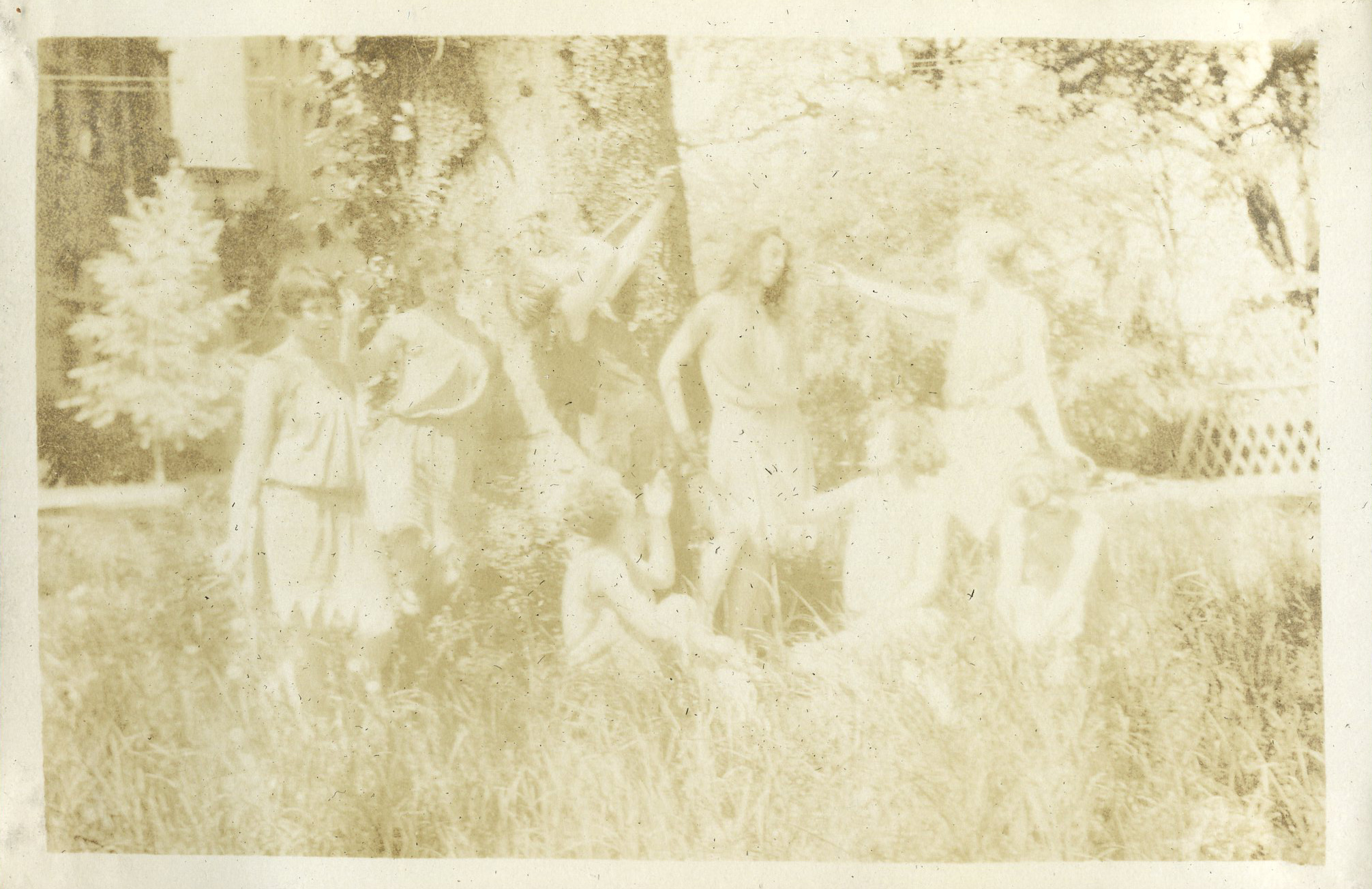 A photograph of a group of Pacific University students dressed in costumes. The students performed The Joy of Morning during the May Day Celebration. The May Day celebration tradition at Pacific University began in 1914, and would continue for over 50 years. A student would be crowned 'Queen of the May'. The event would often include a double-line procession from the Carnegie Library to the west side of Marsh Hall. A luncheon, singing, athletic competitions and other activities would be enjoyed by students and members of the Forest Grove community. A maypole would be erected and young ladies dressed in white would wind ribbon around it. This photograph appears in an album that was compiled by Edith Hansen McGill, a 1930 Pacific University graduate.