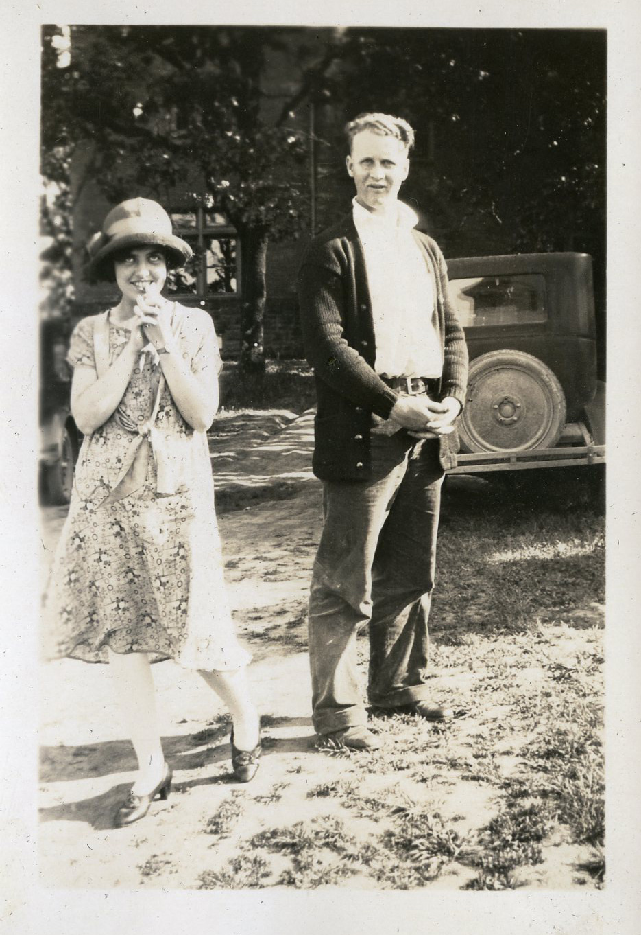 A photograph of two Pacific University students in front of a car that is parked on the lawn in front of Marsh Hall. Marsh Hall was built in 1895 and named after Pacific University president, Sidney Harper Marsh. Marsh Hall housed the university's chapel, recitation rooms, classrooms, administration offices and rooms for the literary societies and the Christian Associations.This photograph appears in an album that was compiled by Edith Hansen McGill, a 1930 Pacific University graduate.
