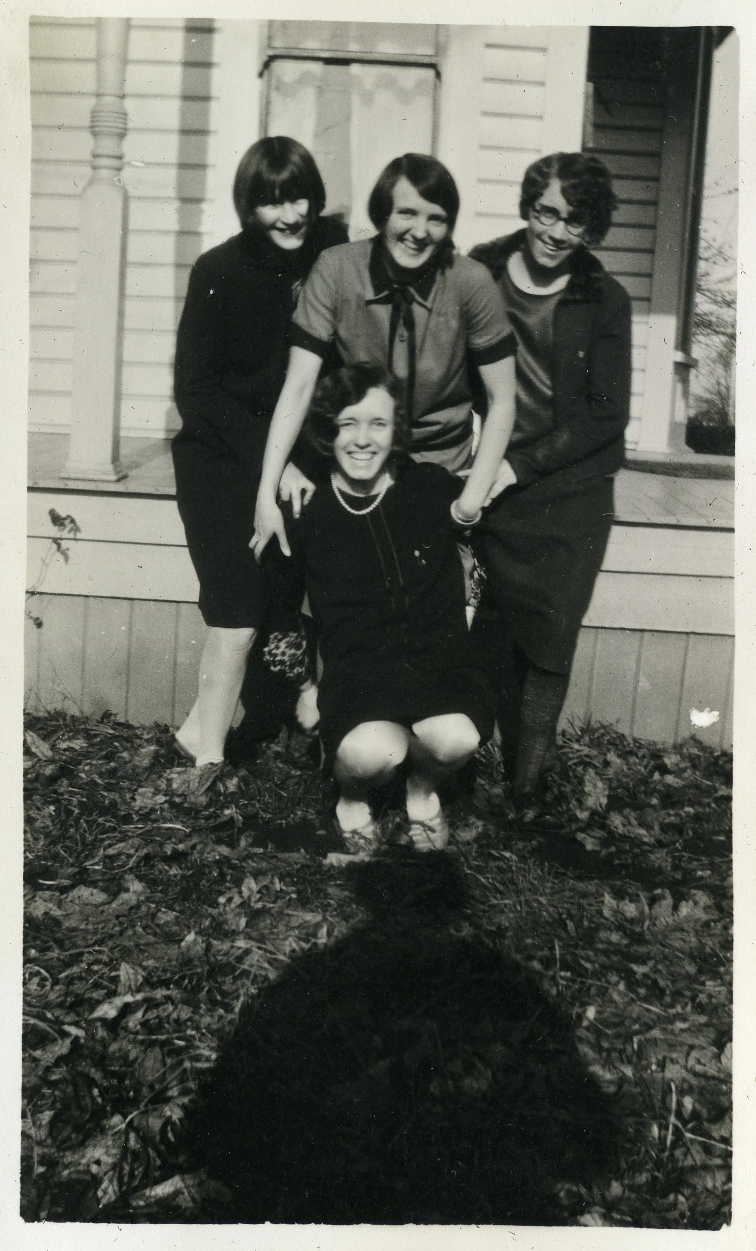 A photograph of four female Pacific University students posing next to a house. This photograph appears in an album that was compiled by Edith Hansen McGill, a 1930 Pacific University graduate.