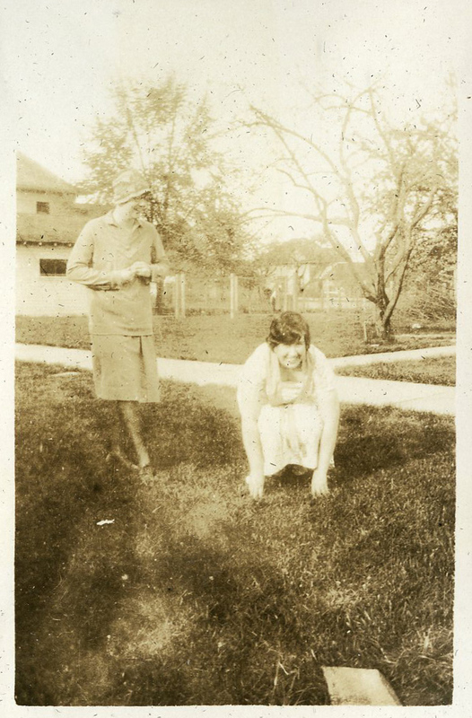 A photograph of two female Pacific University students playing around on some grass. This photograph appears in an album that was compiled by Edith Hansen McGill, a 1930 Pacific University graduate.