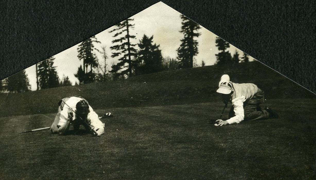 A photograph of two Pacific University students kneeling on a golf course. They are both holding their golf clubs upside down, using them as if they were pool sticks. This photograph appears in an album that was compiled by Edith Hansen McGill, a 1930 Pacific University graduate.