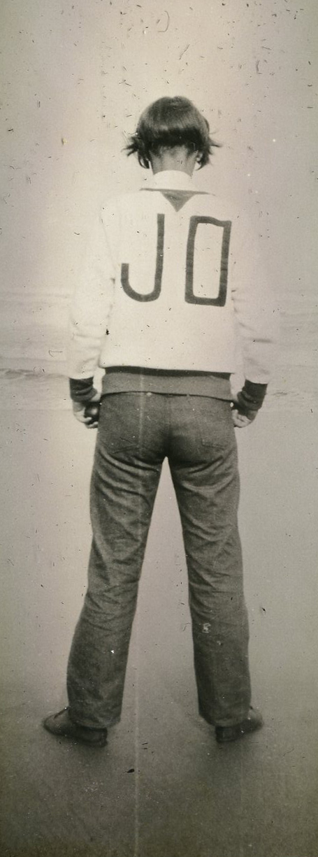 A photograph of a female Pacific University student on the beach. She is wearing a jacket with the letters JO on the back of it. There appears to be a ball in her hand. This photograph appears in an album that was compiled by Edith Hansen McGill, a 1930 Pacific University graduate.