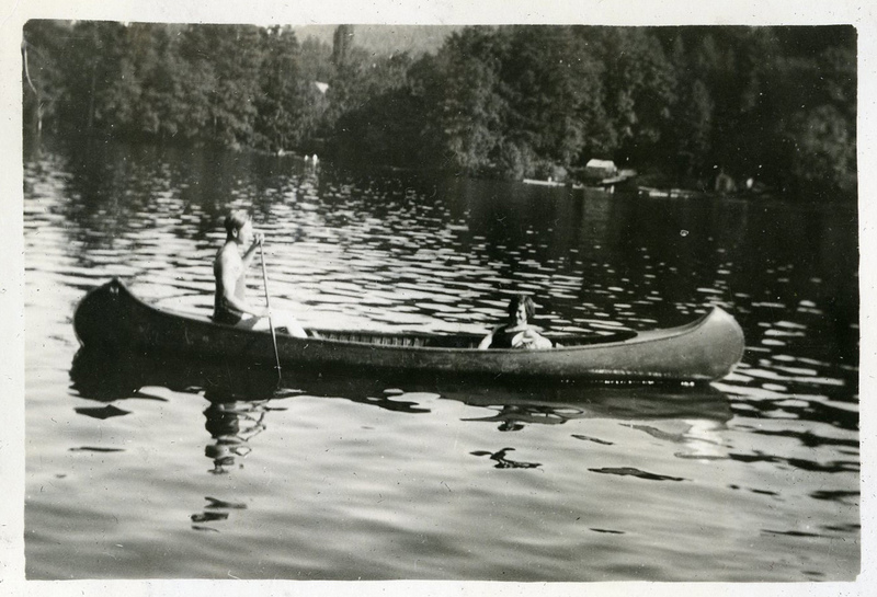 A photograph of two Pacific University students sitting in a canoe. The canoe is in an unidentified body of water. The male student is holding an oar in his hands, while the female student is posing for the camera. This photograph appears in an album that was compiled by Edith Hansen McGill, a 1930 Pacific University graduate.