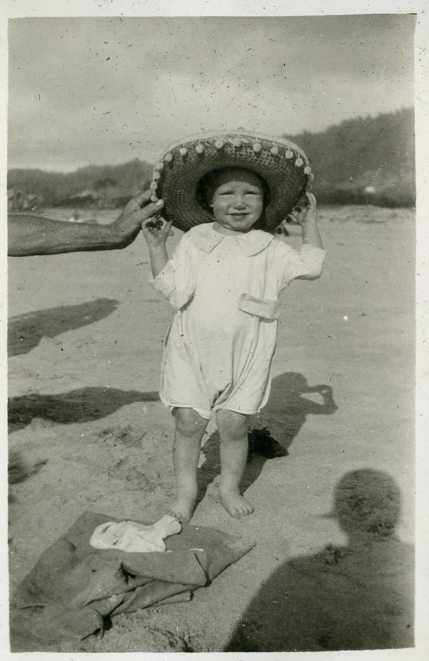 A photograph of an unidentified child standing on the beach. The child is wearing the senior sombrero. This was likely taken on the Oregon coast. The senior sombrero was the adopted hat worn by the Senior class at Pacific University in October, 1926. As was the custom of several universities during this time period. The sombrero would be passed onto the next senior class after graduation. This photograph appears in an album that was compiled by Edith Hansen McGill, a 1930 Pacific University graduate.