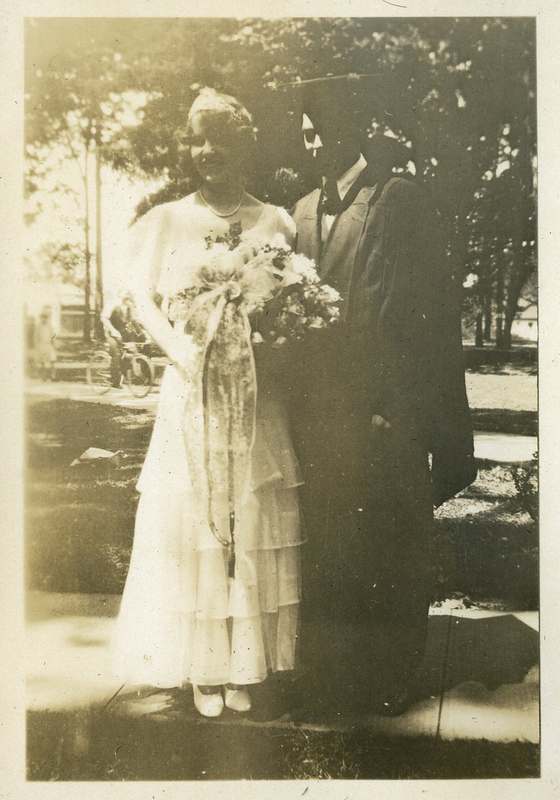A photograph of a Pacific University May Day Queen with her escort. The May Day celebration tradition at Pacific University began in 1914, and would continue for over 50 years. A student would be crowned 'Queen of the May'. The event would often include a double-line procession from the Carnegie Library to the west side of Marsh Hall. A luncheon, singing, athletic competitions and other activities would be enjoyed by students and members of the Forest Grove community. A maypole would be erected and young ladies dressed in white would wind ribbon around it. This photograph appears in an album that was compiled by Edith Hansen McGill, a 1930 Pacific University graduate.