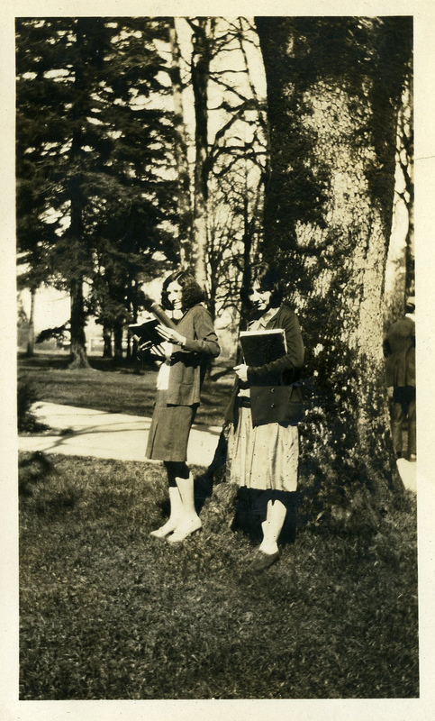 A photograph of two female Pacific University students holding books on the campus lawn. This photograph appears in an album that was compiled by Edith Hansen McGill, a 1930 Pacific University graduate.