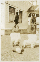A photograph of two Pacific University students doing headstands. A third student appears to be under one of the students doing a headstand. This student is wearing a freshman beanie. This photograph appears in an album that was compiled by Edith Hansen McGill, a 1930 Pacific University graduate.