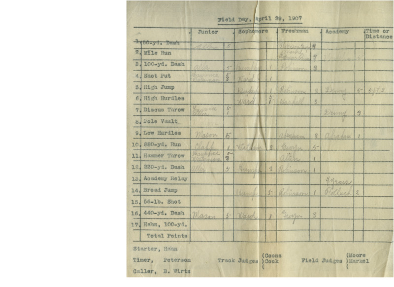 A score sheet for the 1907 Pacific University field day held on April 29th, 1907. This score sheet appears in a scrapbook album compiled by Frances B. Clapp, a Pacific University graduate.