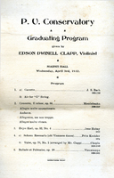 A program for the P.U. Recital held on Wednesday, April 3rd, 1912 in Marsh Hall. This recital program appears in a scrapbook album compiled by Frances B. Clapp, a 1908 Pacific University graduate.
