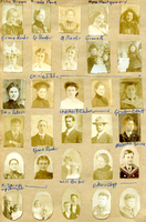 A scrapbook page that contains several cutouts of individual portraits. Some of the portraits feature handwritten captions that identify the people in the portraits. Many of the individuals were Pacific University students. Among the people identified are Frances Abernathy, Alice Sewell '03, C.F. Clapp, Marie Staher, Ada Taylor '14, Grace Thomas '14, Helen Boldrick and France Clapp. This scrapbook page appears in a scrapbook compiled by France B. Clapp, a 1908 Pacific University graduate.
