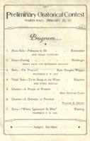 A program from the Preliminary Oratorical Contest held in Marsh Hall on January 25th, 1907. The contest included several students performing piano and vocal solos, story telling, as well as orations. The participants were listed as Acting Director of the Conservatory and Instructor in Piano, Miss Wilma Waggener '04, Music Conservatory students, Miss Maud Shannon and Miss Katheryn Shannon, Professor of English and Public Speaking, F. W. Orr, Miss Ethel Moseley '07, Miss Frances B. Clapp '08 and Mr. William E. Gwynn '10. The winner of the contest was Mr. Gwynn whom was awarded $15 and a gold P. Gwynn also qualified to represent Pacific University in McMinnville for the inter-collegiate contest that was held in March of 1907. This program appears in a scrapbook compiled by Frances B. Clapp.