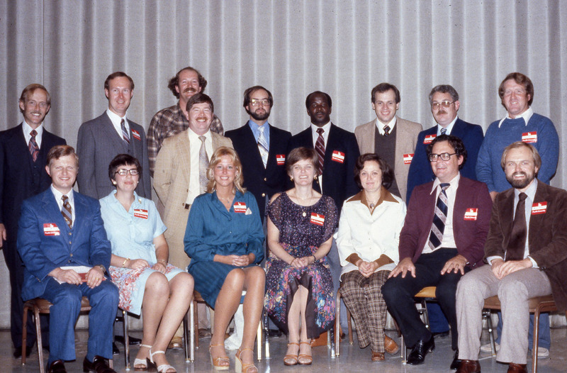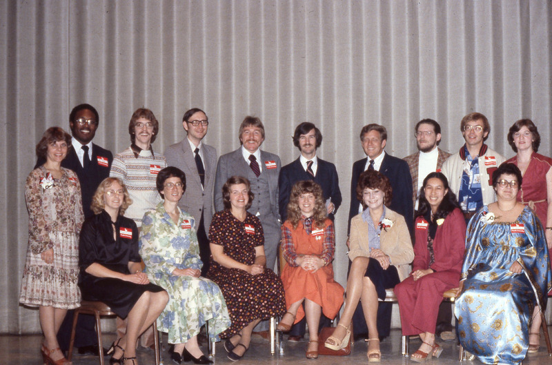 A group portrait of Pacific University alumni who graduated in the 1970s. This is one of a set of group portraits that were taken in October 1980 during Homecoming and Reunion weekend. This image was published in the Pacific University Alumni Magazine, Winter 1980-81 issue, p. 4. The caption for the published image provides their names as: Front row, from left: Margorie Hurst, Emily Rampton, Lyn Sites Beithan, Barbara Wedell, Sandy Lowe, Debbie Haller, Barbara Strain. Back row, from left: Claudell Combs, John Rodgers, Jess Gonnasen, Jeff Pratt, Steve Beithan, Steve Wedell, Warren Mitchell, Donald Higgins, Paul Haller, and Penny Stuve.