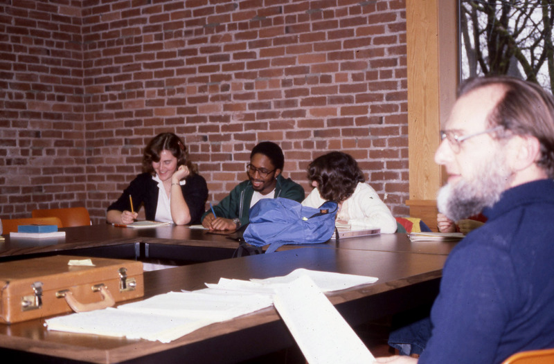 Robert Davies (right), an English Professor at Pacific University, teaching several students in a classroom in Marsh Hall. The original slide was printed in March 1980. It is signed "Jenni Char," probably Jennifer Char Arashiro (Class of 1980); she was likely the photographer.