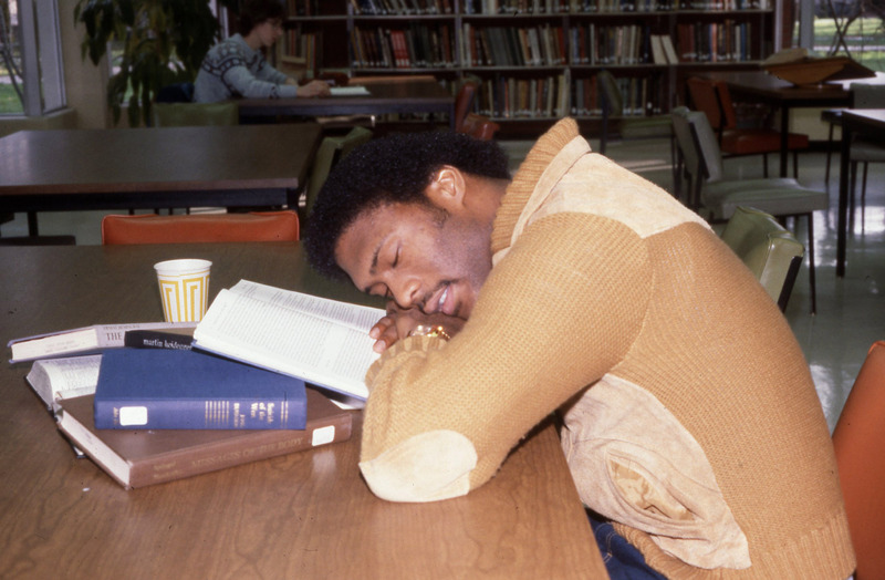A Pacific University student with his down down on a desk covered in books, inside Scott Library on the Pacific campus. The original slide was printed in March 1980. It is signed "Jenni Char," probably Jennifer Char Arashiro (Class of 1980); she was likely the photographer.