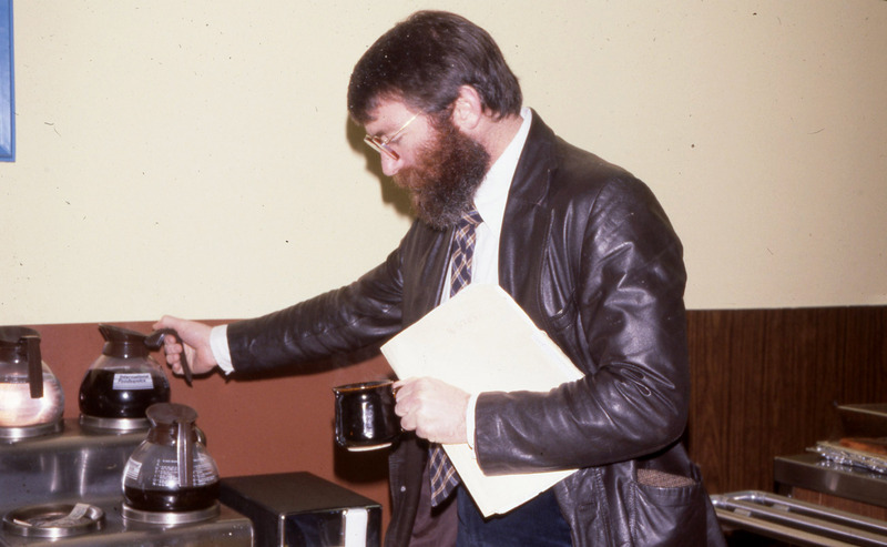 A man wearing a tie and a leather jacket -- probably a Pacific University faculty member -- getting coffee from a set of carafes. The original slide was printed in March 1980. It is signed "Jenni Char," probably Jennifer Char Arashiro (Class of 1980); she was likely the photographer.