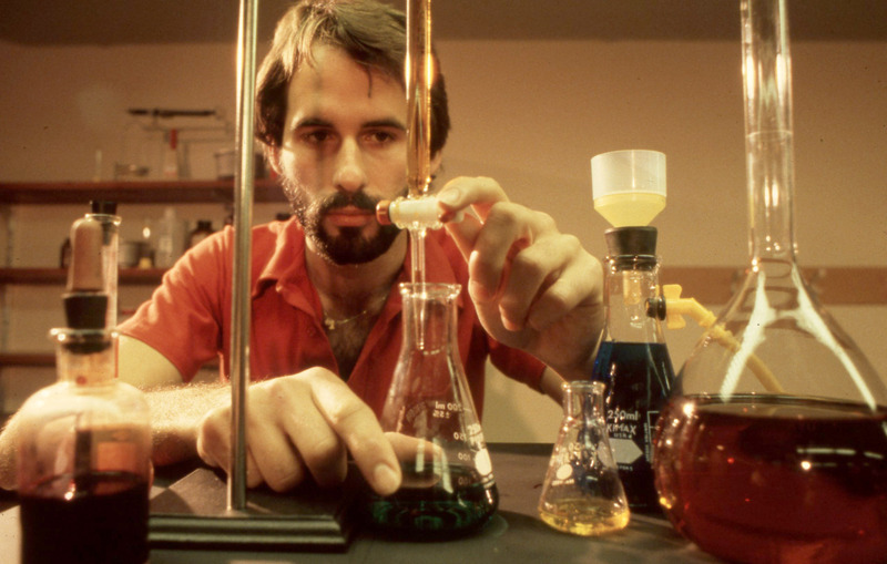 A posed photograph of a man, probably a Pacific University student, performing a chemistry experiment in a lab on campus. The photograph was likely intended to illustrate the new resources available in the "Chemistry Unit of the Science Complex," later named Murdock Hall, which had just opened in January of 1981. The picture was taken by photographer Leo E. Arfer, probably for usage in publications celebrating the opening of the building. Arfer was a professional photographer who also taught photography at Mt. Hood Community College, per his obituary. The original slide is dated February, 1981.