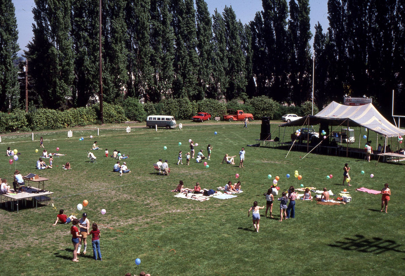 People waiting for the beginning of "Spring Fest," a live music event, on a football field in Forest Grove, Oregon in Spring, 1980. There is a stage in the background and an AV station in the foreground. In the middle ground, a mixed-age audience of children and adults have set up blankets and chairs on the grass, and have decorated with helium balloons. The event was described in the university's alumni magazine: "Lots of sunshine, frisbees, balloons, and music combined to make the third annual Spring Festival a day to remember. Two large tents were erected on the football field and Pacific students were able to picnic and sunbathe from 11 a.m. to 8 p.m. while listening to performers ranging from the Muddy Bottom Boys (bluegrass) to Ki-n-Kaboodle Clowns to Cruise Control (jazz)." (Summer 1980 issue, p. 5)
