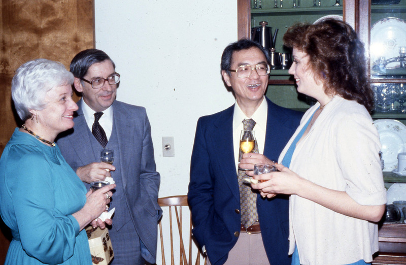 Several men and women who are likely staff and/or alumni of Pacific University, attending a reception. The original slide was printed in February, 1980.