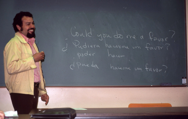 Dr. Juan Guzman teaching Spanish at a blackboard at Pacific University. Guzman was hired in the 1979-1980 academic year to become the director of bilingual education at Pacific University (see Pacific University Alumni Magazine, Spring 1980, p. 17). The original slide was printed in May, 1980. A related photograph that appears to have been taken on the same day was published in the university's annual catalog in 1983-5.