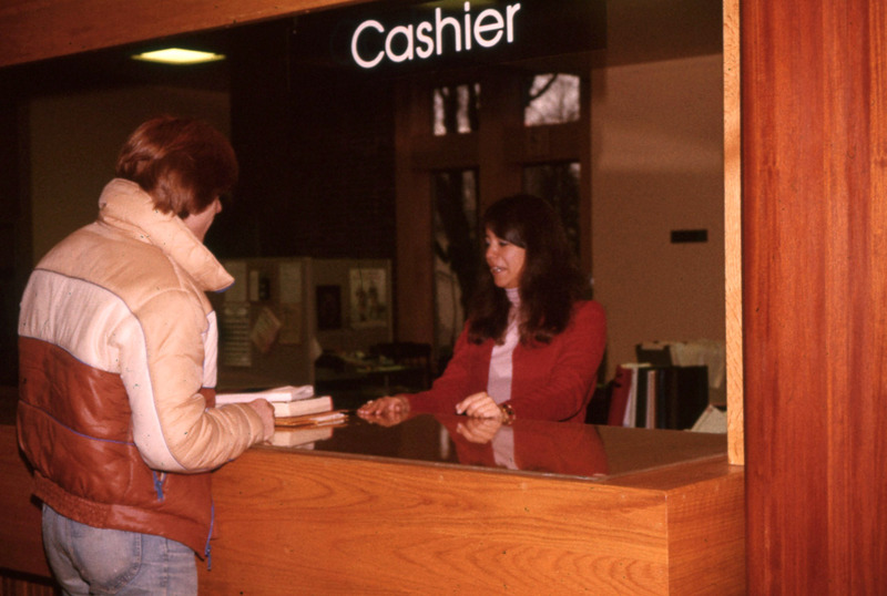 A student speaks to a staff member at the "Cashier" desk on the first floor of Marsh Hall at Pacific University. This was the desk where students settled tuition and other bills. The original slide, which has been color-corrected, was printed in February 1980. It is signed "J. Char," probably Jennifer Char Arashiro (Class of 1980); she was likely the photographer.