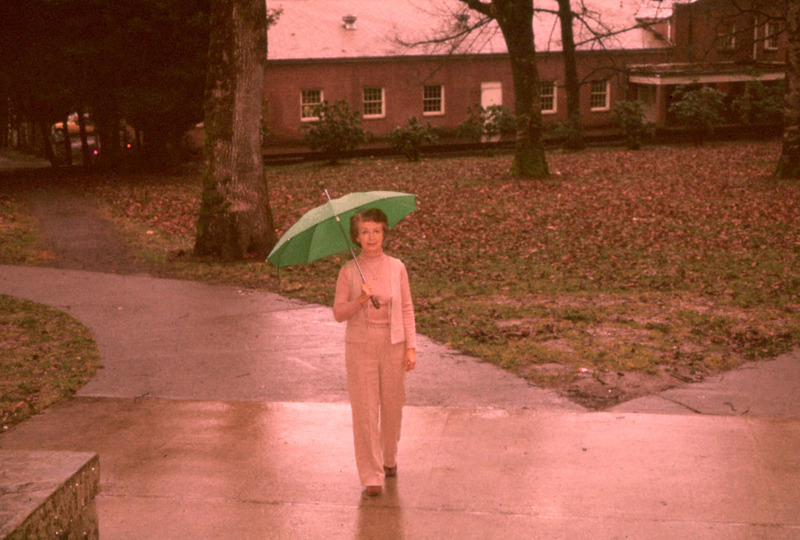 A woman holding an umbrella walking on the Pacific University campus, with Warner Hall in the background. The original slide, which has been color-corrected, was printed in February 1980. It is signed "Jenni Char," probably Jennifer Char Arashiro (Class of 1980); she was likely the photographer.