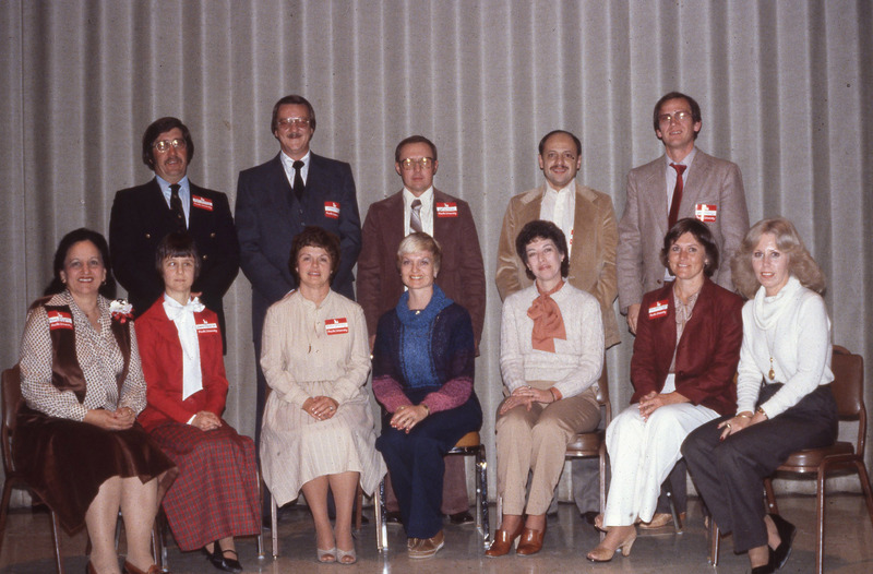 A group portrait of men and women who appear to be alumni of Pacific University; possibly accompanied by some faculty and staff. This is one of a set of group portraits that were taken in October 1980 during Homecoming and Reunion weekend. For a description of the event and other related images, see: Pacific University Alumni Magazine, Winter 1980-81 issue, p. 4.