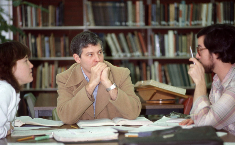 Two men and a woman, probably Pacific University faculty and students, sitting at a table in Scott Library. They appear to be discussing the books that are sitting in front of them. This was likely taken by a staff photographer, possibly for usage in a campus publication. The original slide was printed in March 1980.