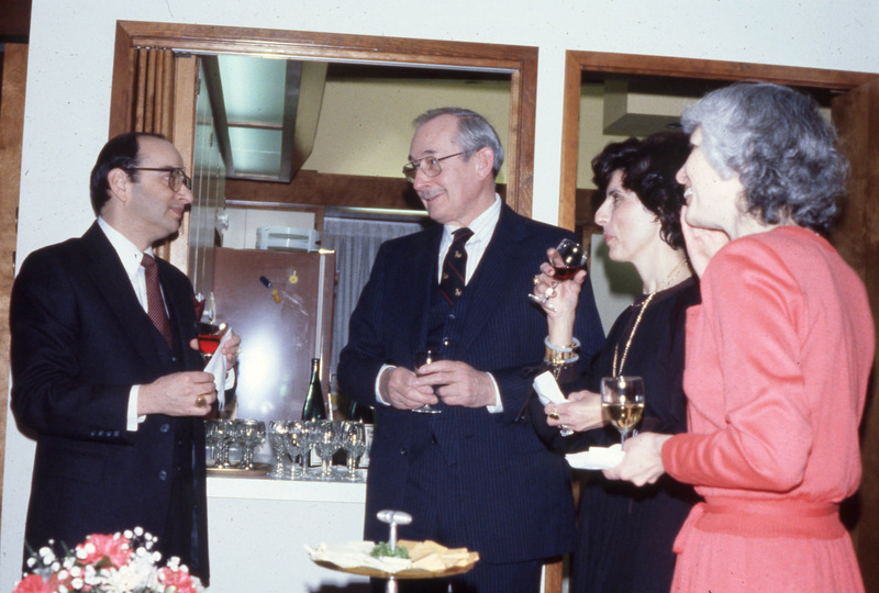 Pacific University President James Miller (center) at a reception, with others who might be alumni standing nearby. The original slide was printed in February, 1980.