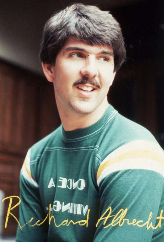 A portrait of Richard Albrecht, who was a student at Pacific University (Class of 1984) at the time this photograph was taken. Albrecht apparently signed the reverse side of the negative. His signature appears here facing in the correct direction, but the wording on his shirt is backwards. The image was likely made by a Pacific staff photographer for use in a campus publication. This slide was printed in September, 1983; but the photograph was taken earlier in that year. A photograph from the same time, but without the signature, was printed in August, 1983; see: PUA_PeoSlides_500. This other slide shows the full wording on his shirt, which reads: "Once a Viking..." This refers to the Forest Grove High School "Vikings," where he was a standout football player before coming to Pacific.