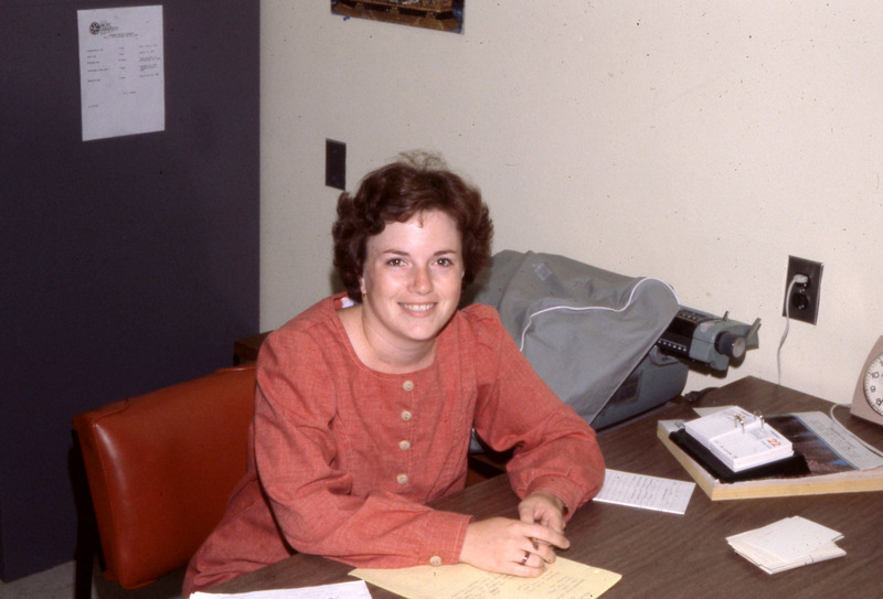 Professor Patricia Sobottka, who was a faculty librarian at Pacific University, in her office. Various library technical manuals are on the bookshelf behind her. The original slide was printed in July, 1979.