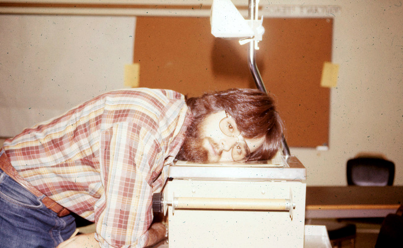 A man, probably a member of Pacific University's AV (audio-visual) department, hamming it up for the camera by laying his head onto the glass of an overhead projector. The original slide was printed in October, 1979. For two other images taken at the same time, see: PUA_PeoSlides_380 and PUA_PeoSlides_382.