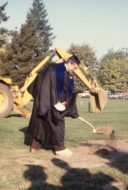 Ralph H. Shumm, Chair of Pacific University's Board of Trustees, at the groundbreaking of Pacific's Murdock Hall in early October, 1979. The event was described in the student newspaper as a "ground-breaking ceremony for the $1.5 million chemistry wing of Pacific's new science facility" (The Index, Oct. 12, 1979).