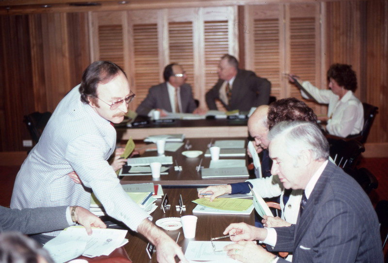 Several men attending a Pacific University Board of Trustees meeting on the third floor of Marsh Hall. This is one of a set of photographs that were all taken during the same meeting. The original slide was printed in March, 1979.