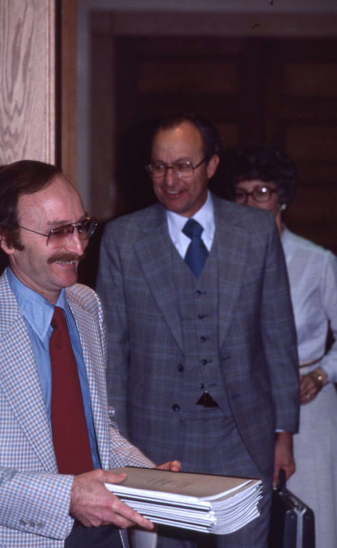 Professor Joe Story, who taught Economics, attending a Pacific University Board of Trustees meeting on the third floor of Marsh Hall. He appears to be carrying booklets to be distributed to the Trustees. This is one of a set of photographs that were all taken during the same meeting. The original slide was printed in March, 1979.