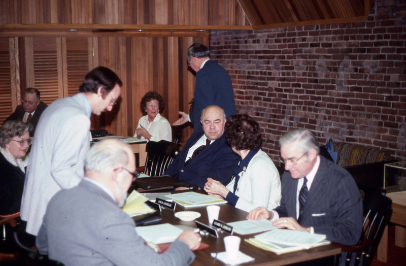 Members of Pacific University's Board of Trustees attending a Trustees' meeting on the third floor of Marsh Hall. This is one of a set of photographs that were all taken during the same meeting. The original slide was printed in March, 1979.