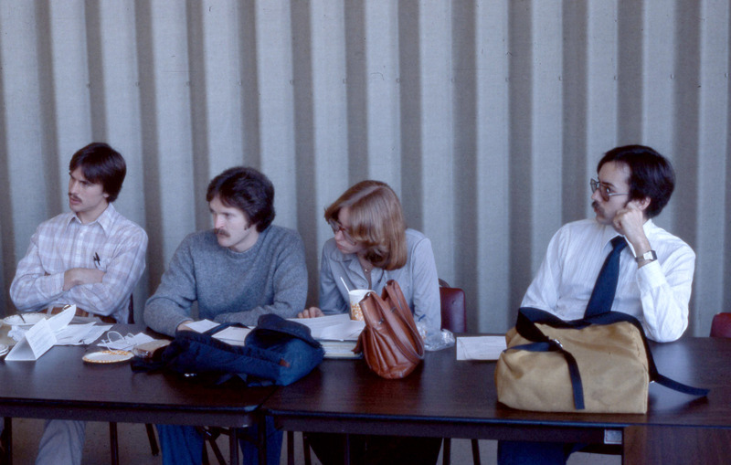 A meeting that appears to include members of Pacific University's faculty or administration as well as students and/or staff, held in Washburne Hall in March 1979. Trays from the cafeteria sit on the table, along with several copies of the same report. At that time, the university was in the midst of reforming its governance system; this meeting may have been held to discuss the issue (see The Index, Mar. 16, 1979). This is one of a set of several photographs taken at the same meeting.