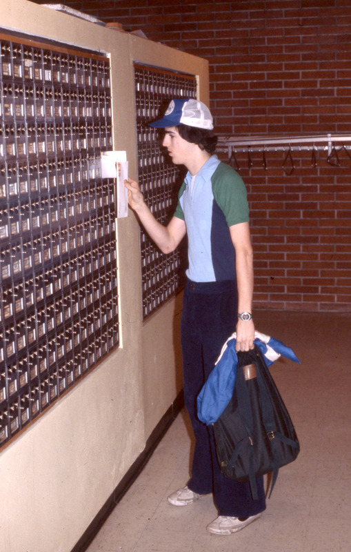 Student Ervin Miller (Pacific University Class of 1982) retrieving mail from his mailbox in the basement of Washburne Hall. The original slide was printed in March, 1979.