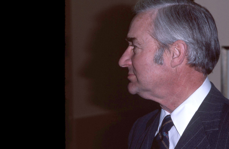 Leland H. Johnson, Treasurer Pacific University's Board of Trustees, while at a Trustees' meeting on the third floor of Marsh Hall. This is one of a set of photographs that were all taken during the same meeting. The original slide was printed in March, 1979.