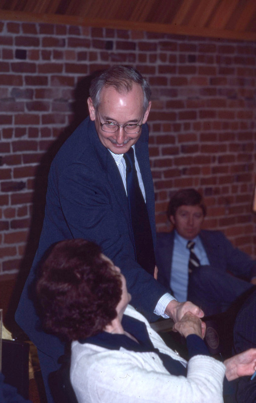 Pacific University President James Miller shaking hands with a woman, while attending a Pacific University Board of Trustees meeting on the third floor of Marsh Hall. This is one of a set of photographs that were all taken during the same meeting. The original slide was printed in March, 1979.