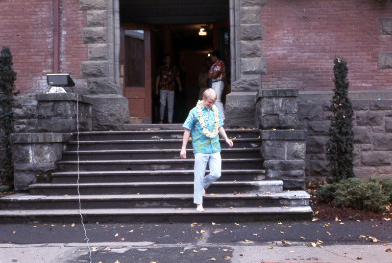 A student wearing an aloha shirt and a lei, walking on Pacific University's campus with Old College Hall in the background. Based on other images found with this slide, he was walking to the university's annual Lu'au, probably in 1969 or 1970.