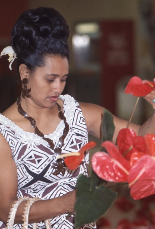 A woman wearing Hawaiian clothing and holding red anthurium flowers at Pacific University's annual Lu'au circa 1969-1970. She was likely the mother or aunt of Millie Ah Ching, a Pacific student who was very active in Haumana O Hawai'i (Hawaiian Club), which hosted the event. The parents of Hawaiian students would ship fresh flowers via from Hawai'i each year for this event, which were used as decorations or sold as concessions.