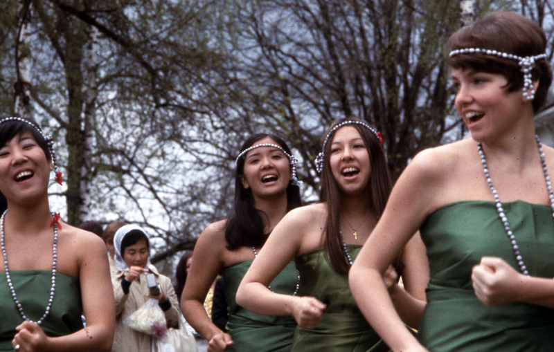 Pacific University women students dressed in green satin dresses and beaded headbands, on their way to perform at the annual Lu'au in 1969 or 1970. The woman in the background holding a camera is identified on another slide as "Miyazono," and is probably a relative of Pacific University student Gail Miyazono, of the Class of 1972.