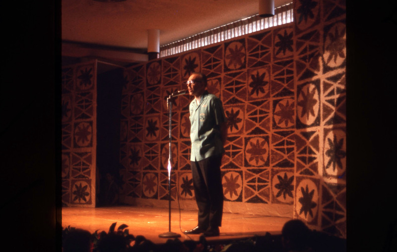 Professor Fred Scheller speaking on stage at Pacific University's annual Lu'au. Scheller taught video and audio production. He was also a founder of Haumana O Hawai'i (Hawaiian Club) at Pacific, and had also helped to organize the first Lu'aus in the early 1960s.