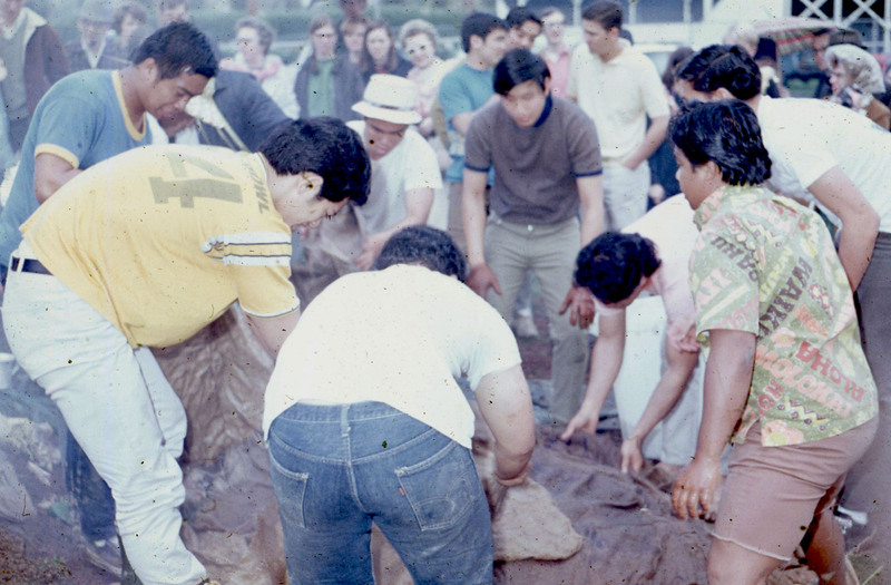 Pacific University students and/or relatives tending the kalua pig roast during the university's annual Lu'au circa 1969-1970. The air appears to be smoky from the fire.