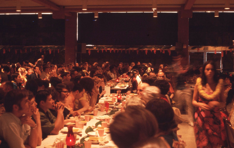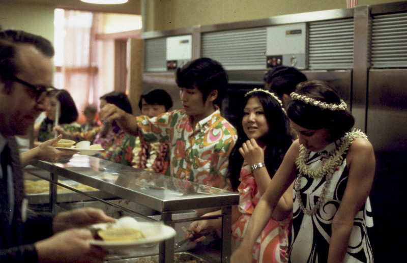 Pacific University students standing in the service line for the buffet at Pacific University's annual Lu'au, circa 1969-1970. A note on the original slide identifies several of the people in the image: Blaine Yata (Class of 1972), Sharon Nonaka (Class of 1974), and Roberta [Klenako?].
