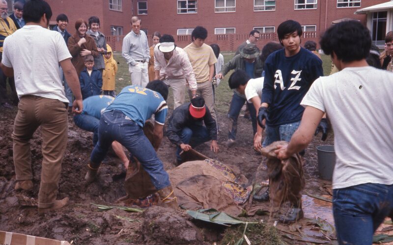 A group of students preparing a kalua pig roast at Pacific University's annual Lu'au, while others observe. One student is wearing an "AZ" (Alpha Zeta) fraternity shirt. This photograph was probably taken around 1971.