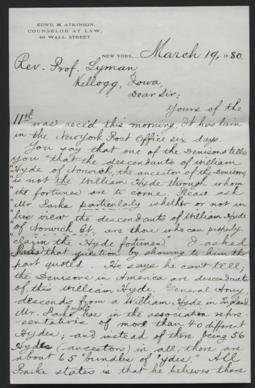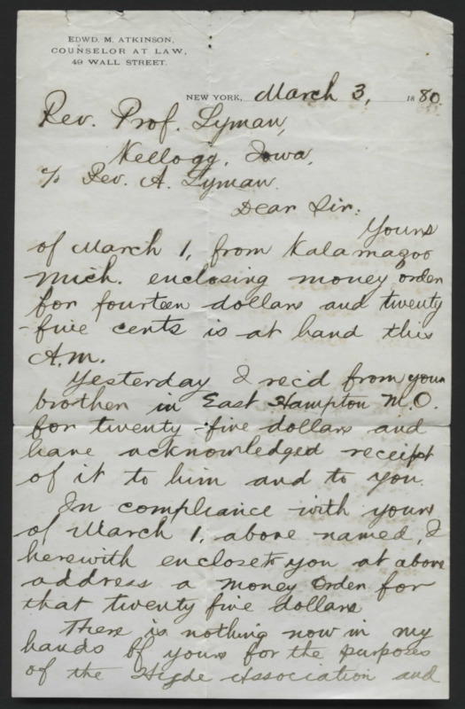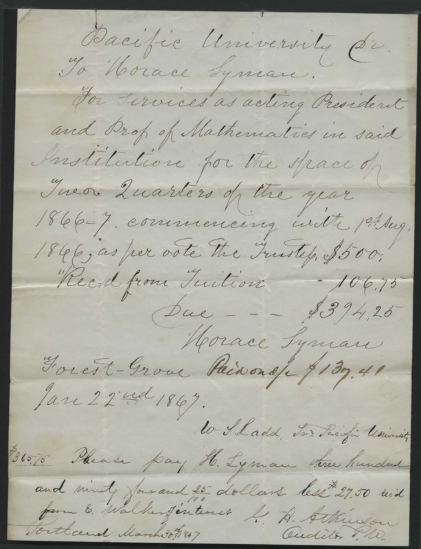 Letter from George H. Atkinson to Reverend Horace Lyman. He discusses the funds to be sent to Reverend Lyman for teaching Mathematics at Pacific University in 1866.