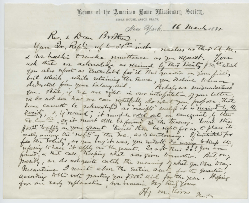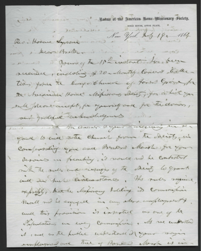 Letter from the American Home Missionary Society to Reverend Horace Lyman. They discuss their inability to grant Lyman a commission for his work in Forest Grove, as he is already employed at Pacific University.