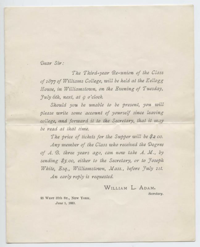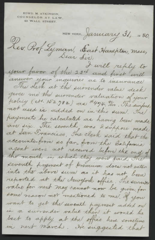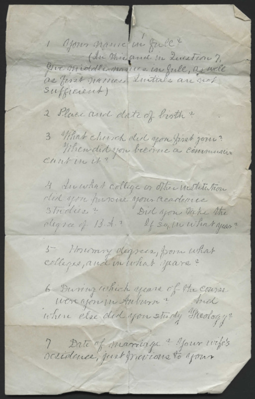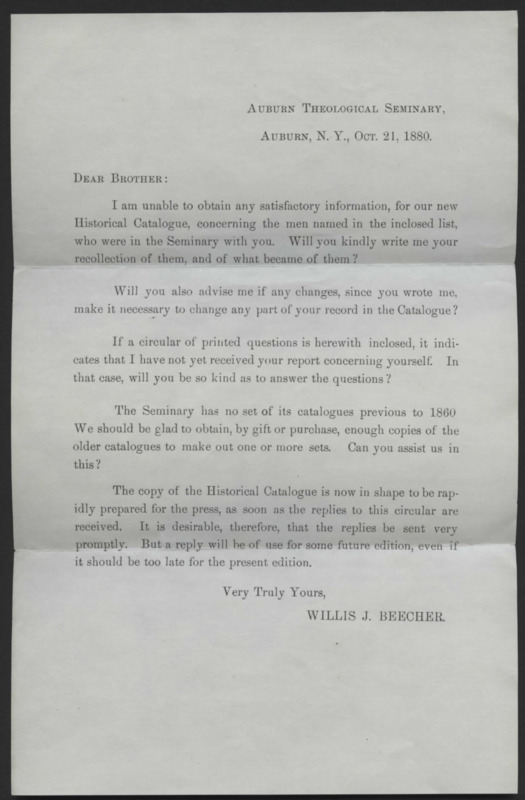 Letter from Willis S. Beecher likely to Reverend Horace Lyman from the Auburn Theological Seminary. He requests information for his seminary's Historical Catalogue and states that he is enclosing a list of people.